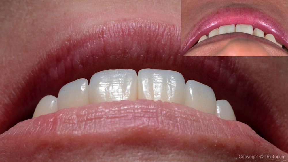 Equilibrio estetico del sorriso abbiamo ricevuto con allargamento dei denti incesivi, e la simmetria di gingiva. Il risultato e’ una impressione più armoniosa della faccia.